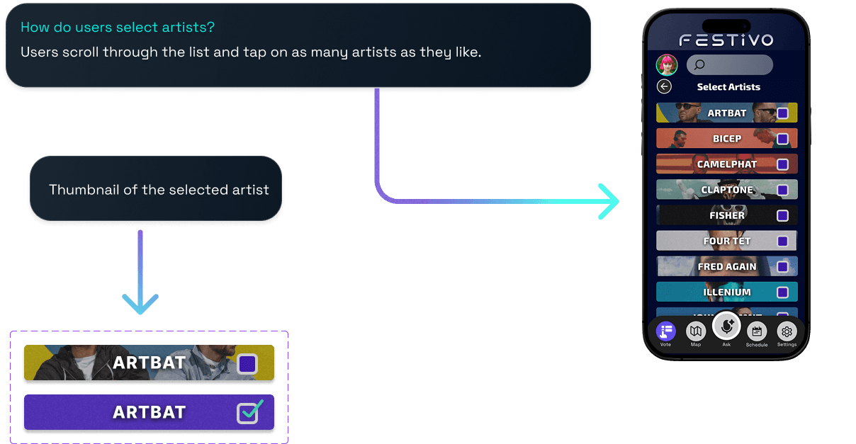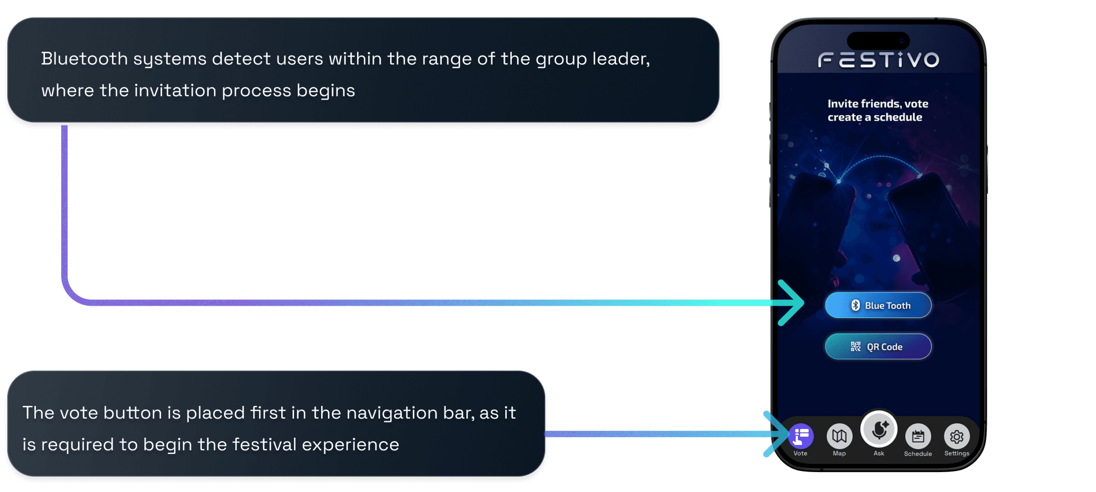 Festivo is designed to enhance the overall quality of a festival visit but one of the biggest challenges was creating a flow where each feature unlocked or triggered the next, like a chain reaction.