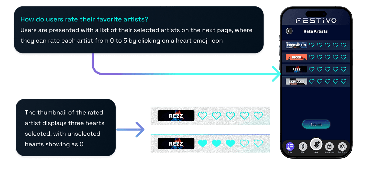 What you see here is the final iteration, refined after mid-fidelity usability testing to streamline navigation and reduce cognitive load in voting for the artists and creating a schedule